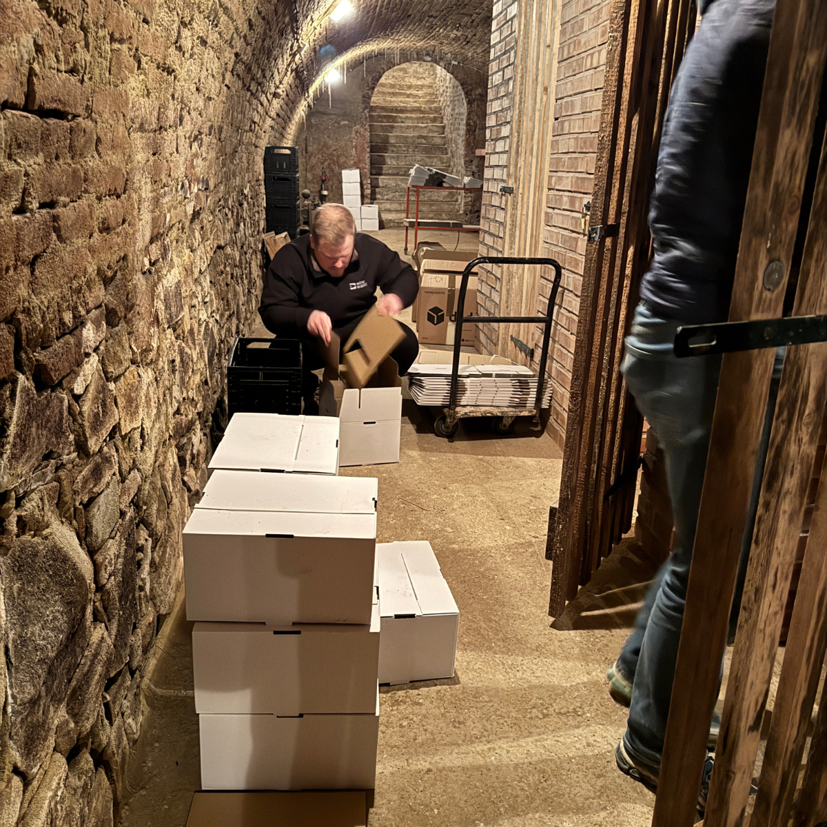 Ein vierköpfiges Team übernahm die Abholung direkt vor Ort. Mit Transporter und Anhänger wurde der gesamte Bestand in einem Tag aus dem Keller über Gang und Stiege ins Lager nach Parndorf übersiedelt. Günther selbst musste dabei nicht mitanpacken und auch nicht die ganze Zeit anwesend sein – es reichte, den Zugang zu ermöglichen. Von der Organisation bis zur Transportversicherung wurde alles durch Wine Wallet organisiert.