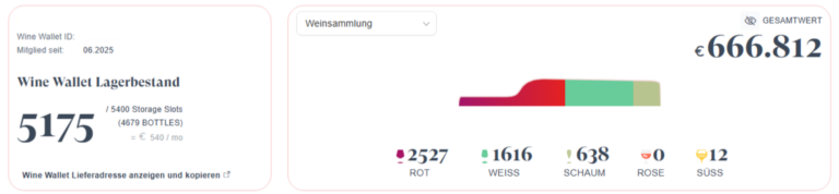 Genau das macht den Unterschied im Alltag. Auf einen Blick sieht er, was vorhanden ist, in welchem Zustand sich die Flaschen befinden und was für ein Dinner, ein Tasting oder einen besonderen Anlass verfügbar ist. Neue Weine können direkt zu Wine Wallet geliefert werden, ohne vorher privat organisiert werden zu müssen.
